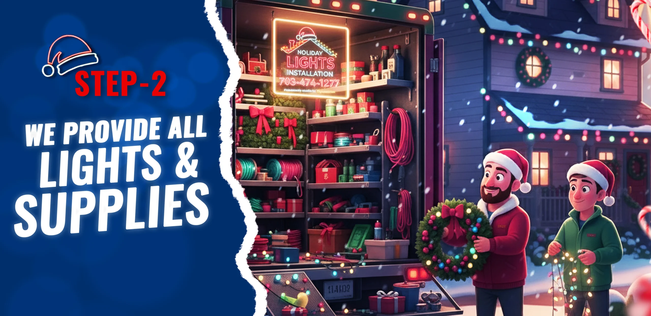 We simplify your holidays by supplying 100% of the lights and materials needed for your display.