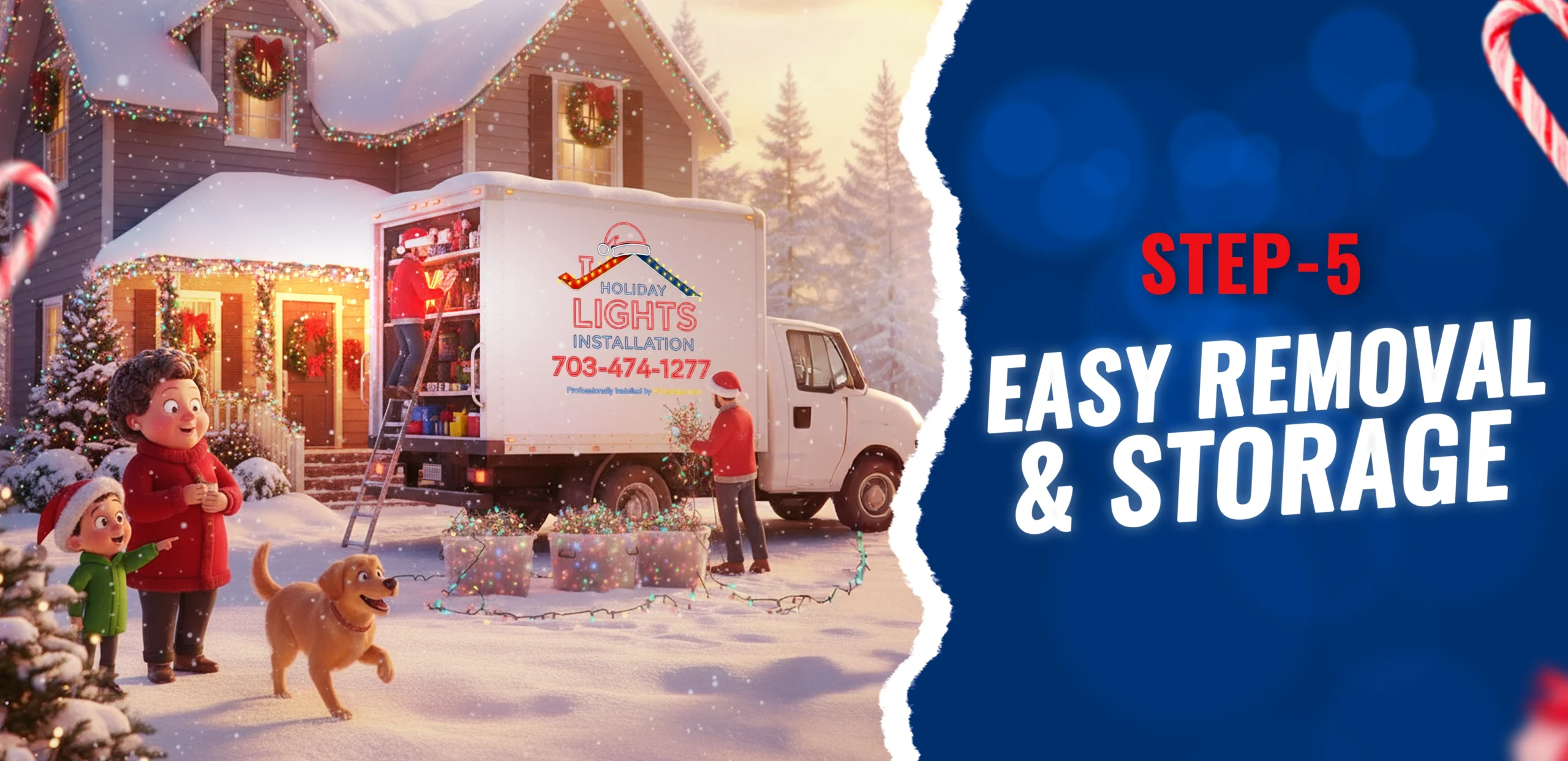 We then take everything away and professionally store it at our facility. Say goodbye to clutter—your lights will be perfectly ready for next year!